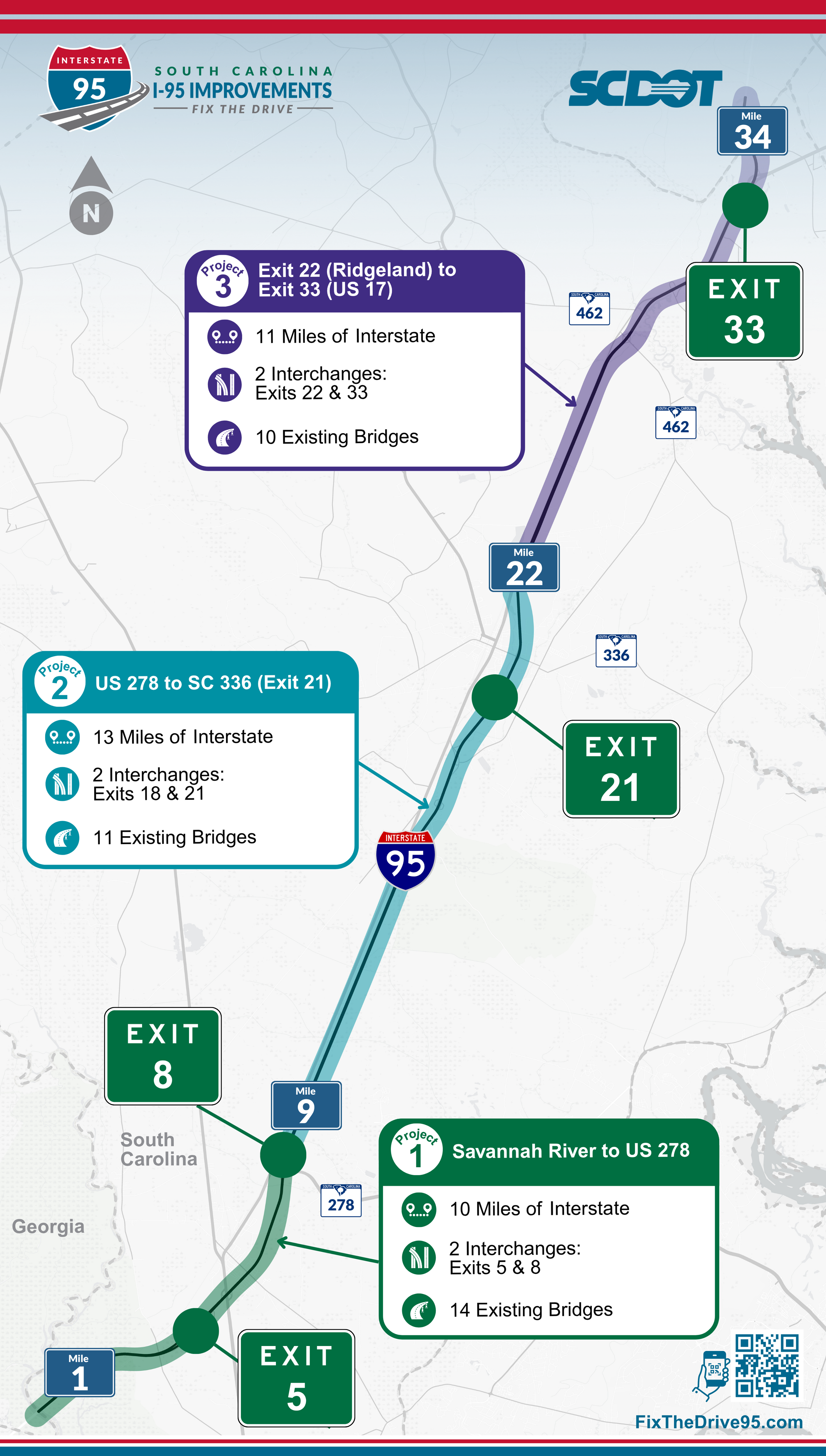 Building on the improvements currently being constructed on I-95 from the Georgia border to Exit 8, SCDOT is evaluating ways to Fix The Drive on I-95 between Miles 8 and 21 while planning for future growth in this corridor.