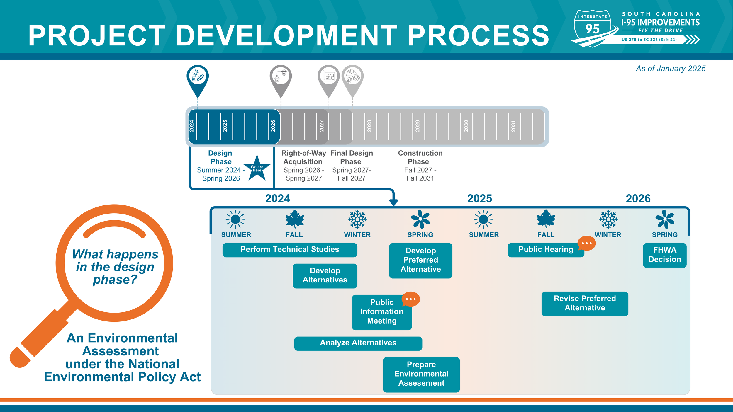 Through a combination of widening, resurfacing, interchange improvements, and the replacement or rehabilitation of aging bridges along the I-95 corridor, SCDOT is taking a comprehensive approach to “Fix the Drive on I-95.” The proposed improvements detailed on this webpage are part of this larger effort.